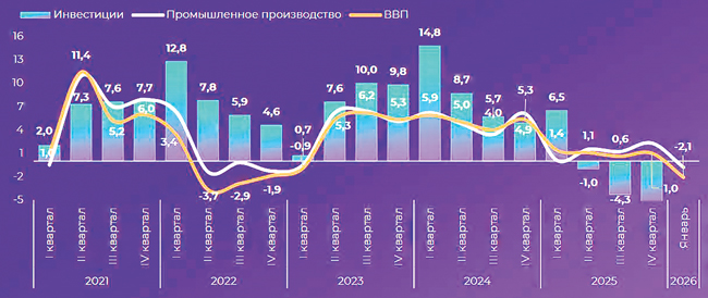 В январе 2026 года ВВП сократился на 2,1% в годовом выражении после роста на 1% в декабре прошлого года. Снижение показателя во многом было обусловлено сезонными и календарными факторами: более холодная зима привела к падению строительных работ, а количество рабочих дней было на два дня меньше, чем за аналогичный период прошлого года. При учете календарного фактора снижение ВВП составило 0,8%, подсчитали аналитики Центра стратегических разработок. Промышленность в январе продемонстрировала снижение на 0,8% в годовом выражении. В частности, практически во всех секторах (в 20 из 24 подотраслей) обрабатывающей промышленности наблюдался спад выпуска.