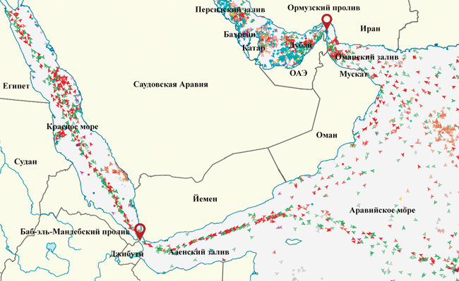 В условиях блокировки Ормузского пролива часть потоков была перенаправлена на Баб-эль-Мандебский пролив. Он соединяет Красное море с Аденским заливом и Аравийским морем, а через Суэцкий канал – Азию с Африканским Рогом и Европой. Ежедневные поставки нефти через этот пролив оцениваются в 8 млн барр. нефти. Кроме того, по нему проходит около 40% товарооборота между Азией и Европой. Ежегодная стоимость продукции, перевозимой через Баб-эль-Мандебский пролив, превышает 800 млрд долл. Считается, что блокировка Ормузского пролива повысила значение Баб-эль-Мандебского пролива как альтернативы морских поставок. Так, после остановки судоходства через Ормузский пролив Саудовская Аравия перебросила примерно треть поставок по нефтепроводу к терминалу на побережье Красного моря, откуда нефть идет в Азию.